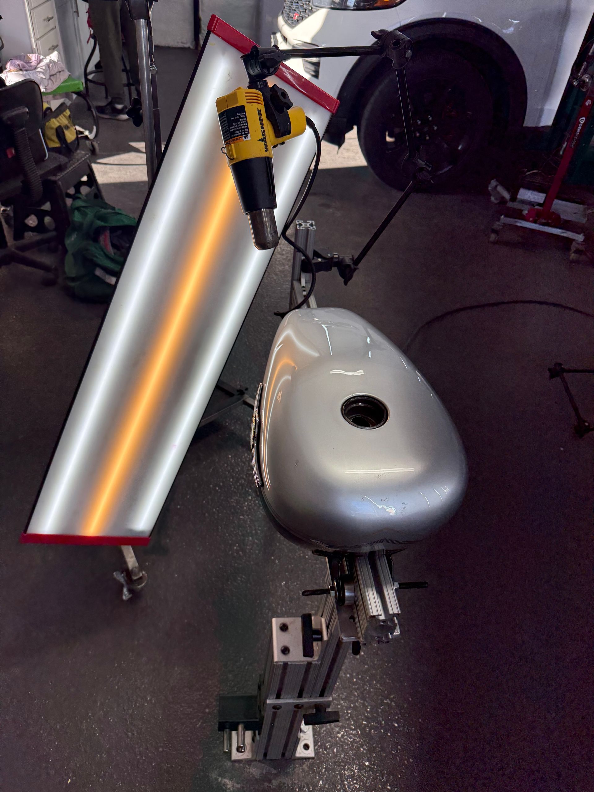 Motorcycle tanks and bodywork present unique challenges because the metal is often thinner, the curves are more pronounced, and access points are limited compared to automotive panels. The technician works carefully to reshape the dent without overstressing the metal, using rods with smaller tips and more precise control to match the contour of the tank or fender.